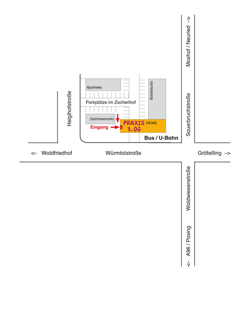 Die Praxis liegt zentral und sehr gut erreichbar im Stadtviertel Großhadern am Zacherlhof. Unser Eingang befindet sich schräg gegenüber vom Getränkemarkt.